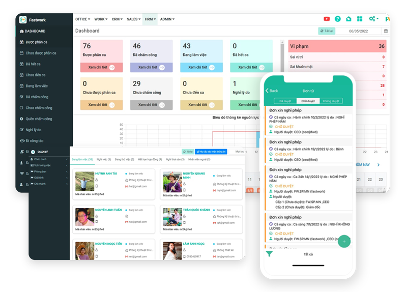 Quản lý dễ dàng phân ca, lập lịch làm việc, xử lý tăng ca, đổi ca, điều phối nhanh nhân sự hỗ trợ khách hàng.