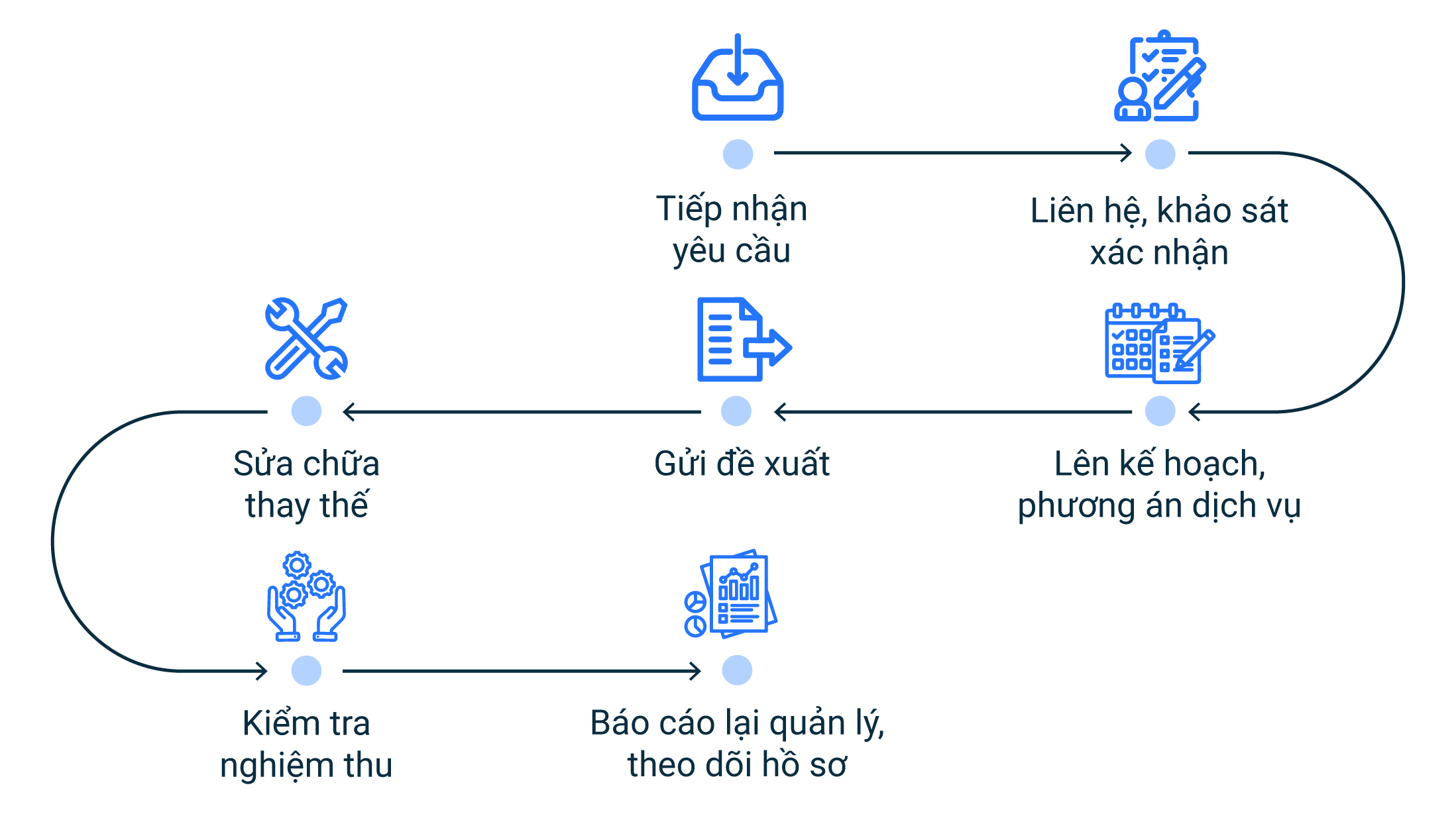 Kiểm tra các yêu cầu bảo trì lắp đặt, cập nhật trạng thái thực hiện, báo cáo các vấn đề, kết quả công việc