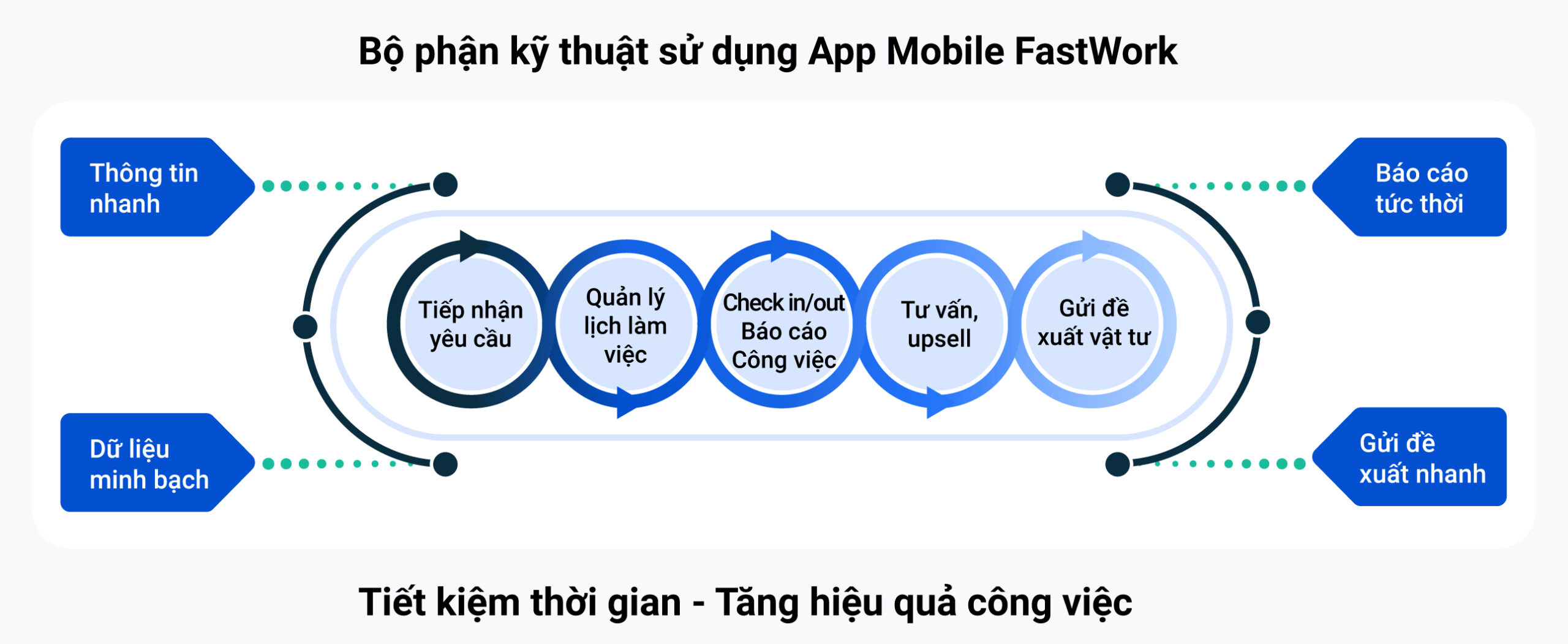 Thay thế cách thức nhận và báo cáo công việc truyền thống qua gọi điện, nhắn tin, ghi chép sổ, giấy tờ, nhân sự dịch vụ kỹ thuật chỉ cần sử dụng App Fast Service để nhận, quản lý, báo cáo, trao đổi toàn bộ công việc.