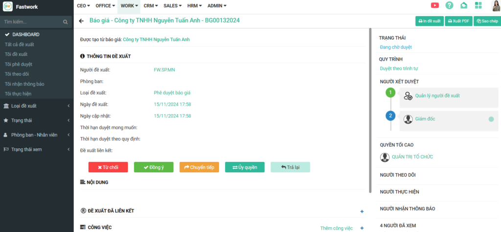 Demo mẫu số hóa quy trình đề xuất – phê duyệt trên phần mềm FastWork